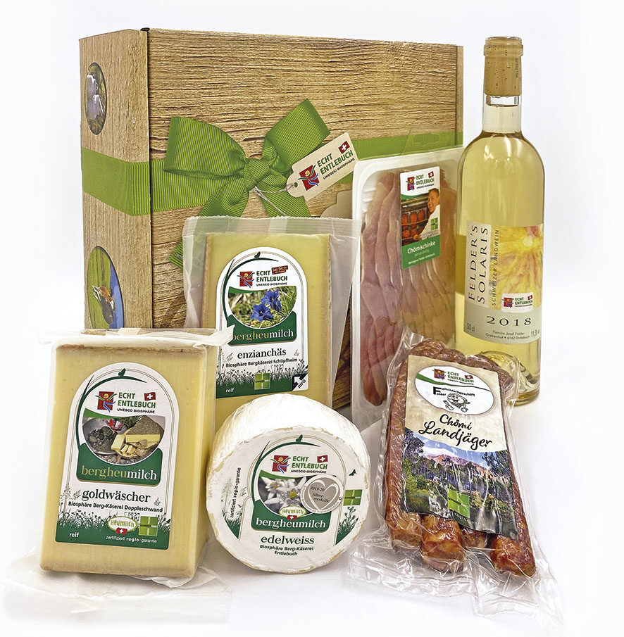 • Rahmweichkäse Edelweiss, ca. 150g (Produzent: Biosphäre Berg-Käserei Doppleschwand) • Chömischinke, geschnitten ca. 100g (Produzent: Metzgerei Felder, Entlebuch) • Enzian-Käse, ca. 200g (Produzent: Biosphäre Berg-Käserei Doppleschwand) • Goldwäscher-Käse, ca. 200g (Produzent: Biosphäre Berg-Käserei Doppleschwand) • Chömi-Landjäger, 2 Paar (Produzent: Metzgerei Felder, Entlebuch) • Solaris Weisswein, 11,3% Vol., 5dl (Silvia Bucher Doppleschwand oder Josef Felder Entlebuch)