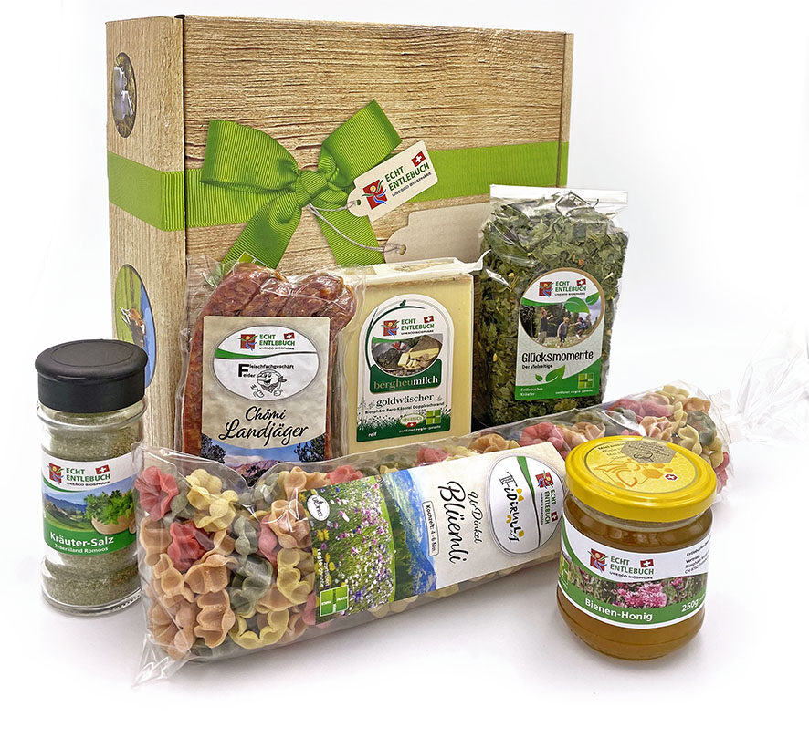 • UrDinkel-Teigwaren Blüemli 350g (Produzent: Entlebucher Teigwaren, Schüpfheim) • Teemischung «Glücksmomente», 40g (Produzent: Genossenschaft Entlebucher Kräuter) • Goldwäscherkäse ca. 200g (Produzent: Biosphäre Berg-Käserei Doppleschwand) • Chömi-Landjäger, 2 Paar (Produzent: Metzgerei Felder, Entlebuch) • Entlebucher Kräutersalz, 60g (Produzent: Zyberliland Romoos) • Bienenhonig, 250g (Produzent: Beat Cresta, Hasle)